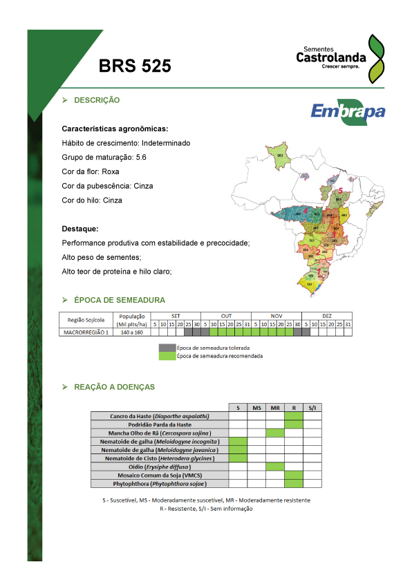 Hábito de crescimento: Indeterminado Grupo de maturação: 5.6 Cor da flor: Roxa Cor da pubescência: Cinza Cor do hilo: Cinza