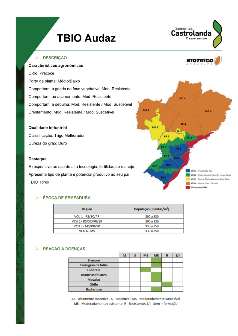 Excelente sanidade (similar ao TBIO Sossego), com ótimo nível de resistência à Mancha foliar, Bacteriose e Mosaico do trigo. Destaque para a elevada resistência à Brusone e Giberela