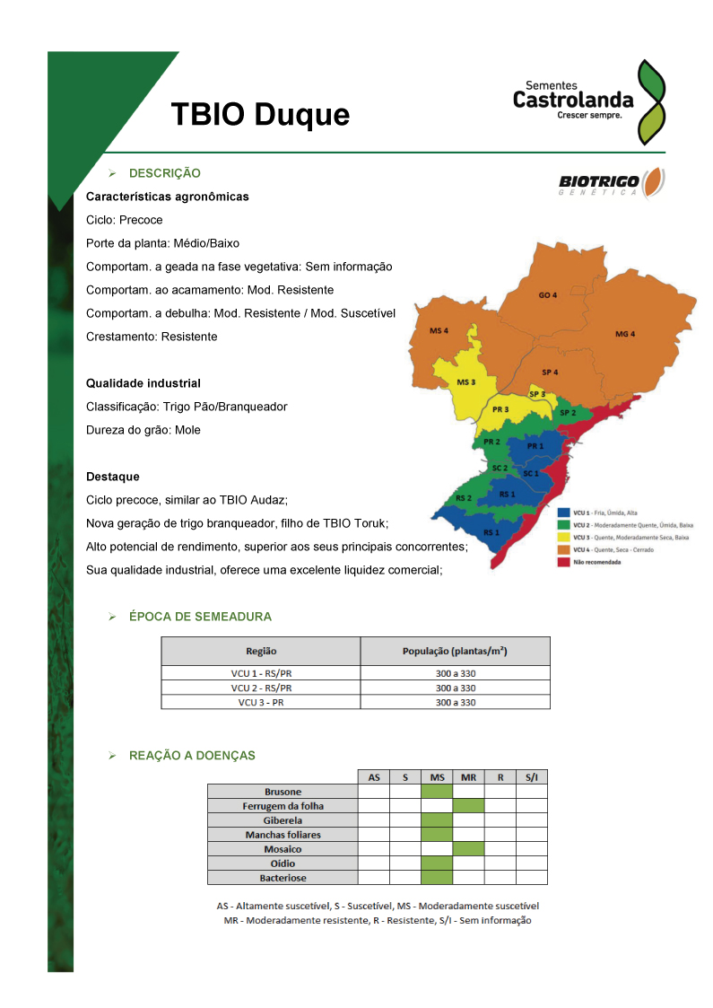 Alto nível de resistência. Nas folhas: apresenta excelente reação ao complexo de manchas, ferrugem e bacteriose. Na espiga: mantém o ótimo nível de segurança das cultivares TBIO, destacando-se ao enfrentar condições favoráveis à Brusone, Giberela e germinação na espiga