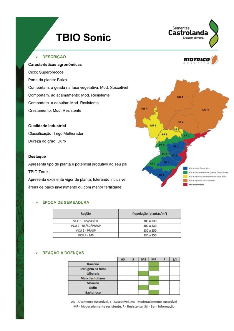 Excelente sanidade (similar ao TBIO Sossego), com ótimo nível de resistência à Mancha foliar e Bacteriose. Destaque para a elevada resistência à Brusone e Mosaico